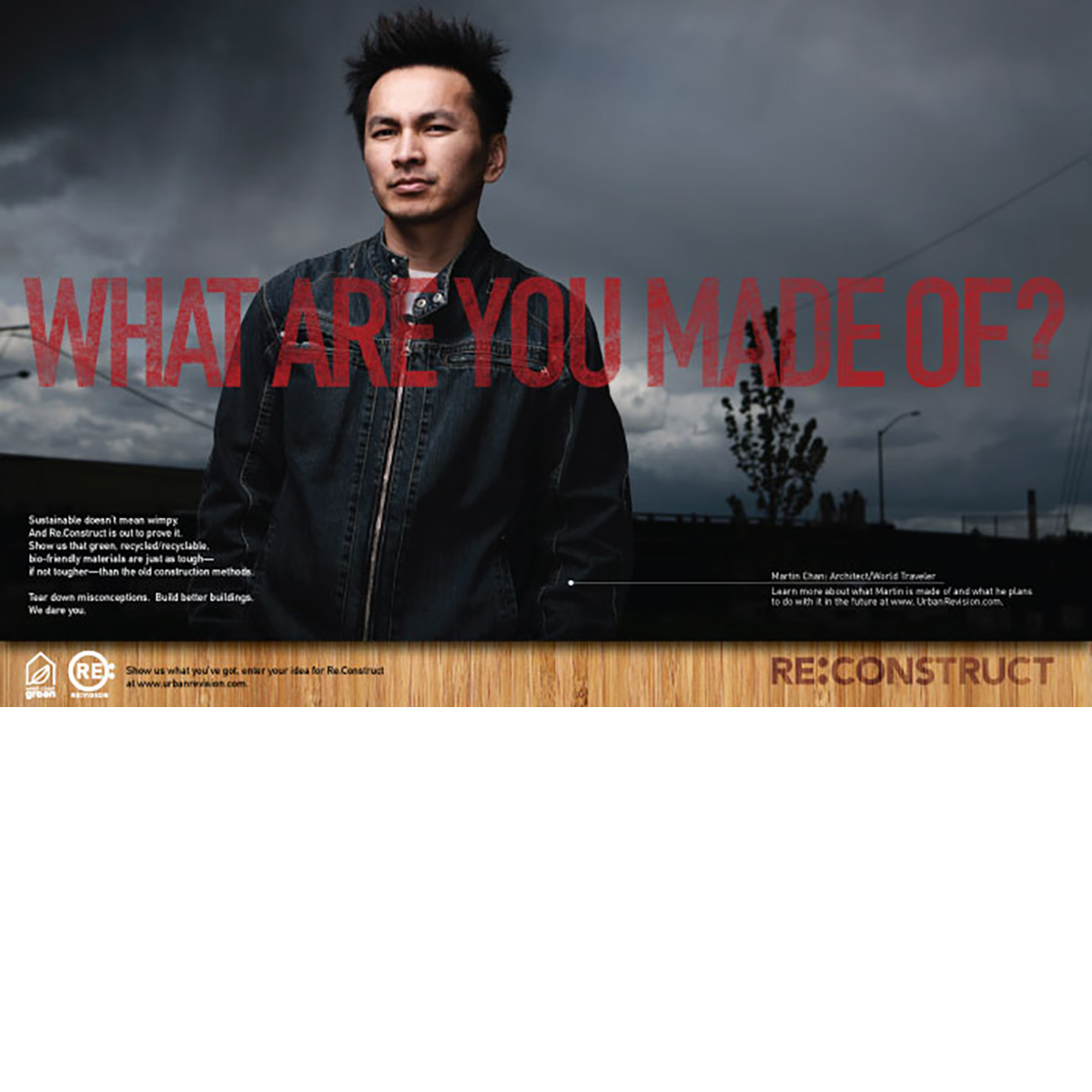 What are we made of? Do we have what it takes to make a difference? Can we rebuild a sustainable foundation for the future? It’s time for a change in the way we see things, in the way we do things. It’s time for what we build to reflect who we are and what we’re made of. It’s time to Re:Construct the ideas and realities of sustainable building. We were looking for your inventive ways to create new types of structures and techniques—or renovate old ones. From planning codes to toilets, dry wall to moveable walls we want your help in reimagining the building industry. Change the parts of construction and you’ll reinvent the act of construction itself.You are what you build. Re:Construct is your chance to reinvent yourself.